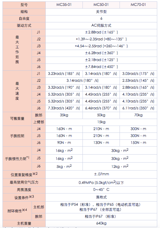 根据腕部可搬运重量的不同,备有MC35(可搬运重量为35Kg)、MC50(可搬运重量为50kg)、MC70(可搬运重量为70kg)3种类型。